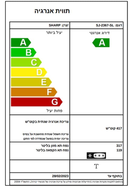 בדקו את תווית האנרגיה על המקרר במעמד הרכישה. אם אינכם מבינים את הסימון, שאלו את המוכר המלווה אתכם בתהליך הבחירה. חפשו דגמים שדורגו כבעלי דירוג אנרגטי A/B. הנה דוגמה: