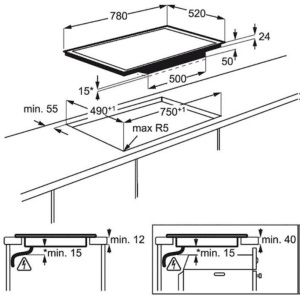 (בנוסף דרוש מרווח מינימלי לאוורור של 2 ס”מ מתחת לכיריים)