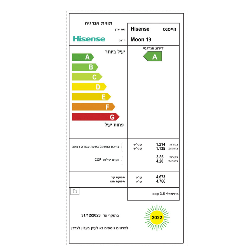 COP קירור: 3.85