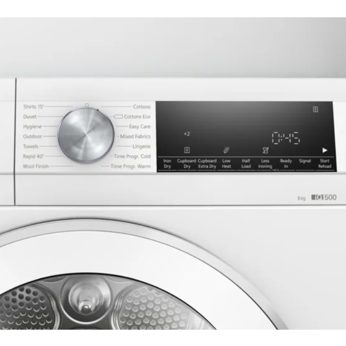 לחצני מגע: הפעלה/השהיה, חום נמוך, גיהוץ קל,Half Load : לחצן חצי כמות, קביעת זמן הייבוש, כיוון עדין של דרגת הייבוש, הפעלה/כיבוי צליל סיום, טיימר להפעלה מאוחרת עד 24 שעות מראש