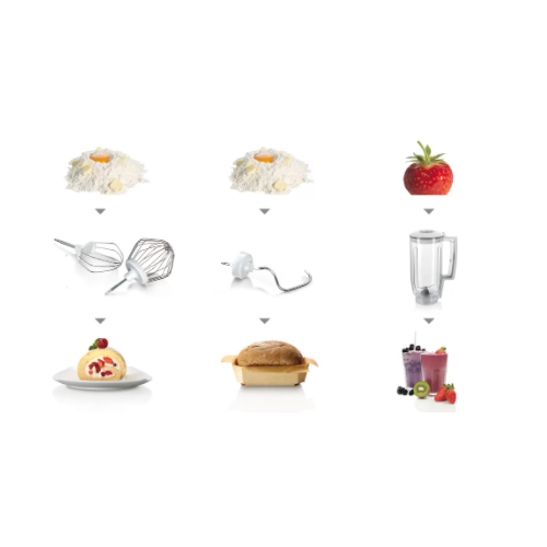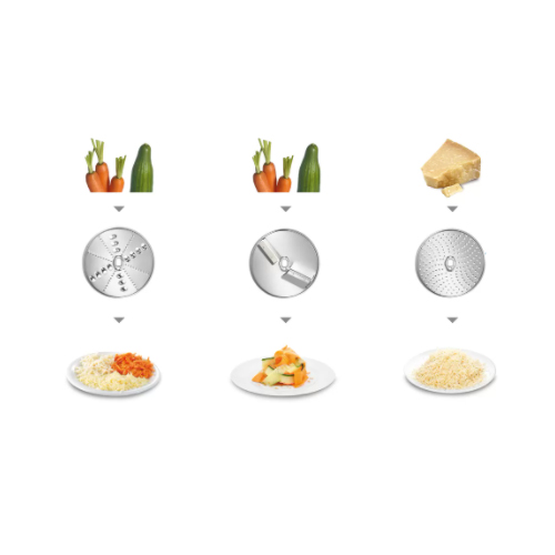 מעבד מזון פתוח כולל 3 דסקיות (5 שימושים): דסקית פריסה דו צדדית(עבה ודק), דסקית פומפייה דו צדדית (גס ועדין) ודסקית גירוד לשוקולד פרמז’ן ואגוזים