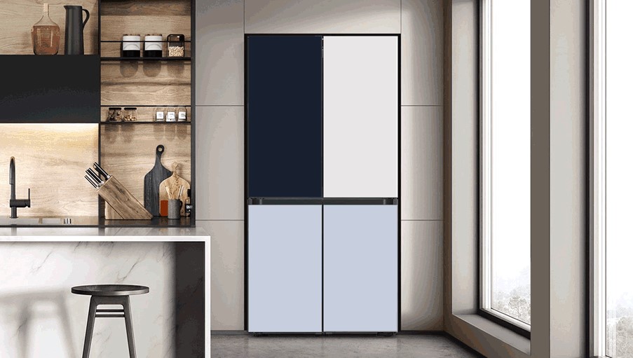 מקרר 4 דלתות עם קיוסק מלא, בנפח כללי 938 ליטר מסדרת BESPOKE היוקרתית, בעלת חזית זכוכית מחוסמת הניתנת להחלפה