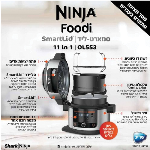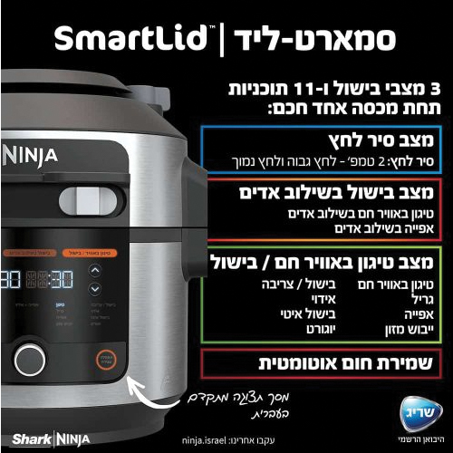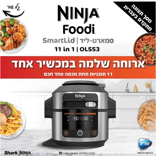 נינג’ה סמארט ליד, ה-NINJA שיהפוך את החיים במטבח לקלים יותר! ארוחה שלמה במכשיר אחד עם 11 – תכניות בישול מתקדמות ו-3 מצבי בישול: סיר לחץ, בישול בשילוב אדים וטיגון באוויר חם. הכל תחת מכסה אחד חכם עם פאנל תצוגה מתקדם בעברית!