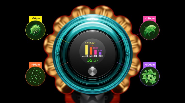 צג ה LCD בראש השואב מציג את כמות וסוג החלקיקים הנשאבים, כהוכחה מדעית לכך שהבית נקי באופן יסודי.