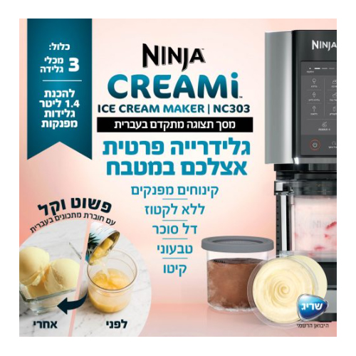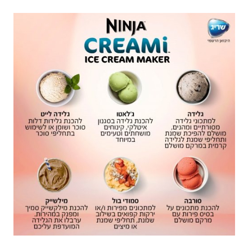 גלידרייה פרטית אצלכם במטבח! בעזרת טכנולוגיית Creamfy™ הייחודית ופאנל תצוגה מתקדם בעברית, מכונת הגלידה הביתית נינג’ה קרימי תהפוך כמעט כל מרכיב לגלידה ,סורבה, מילקשייק, סמודי בול, ג’לאטו ועוד.