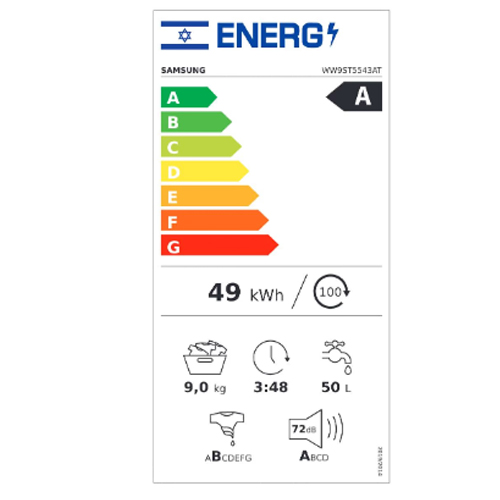 מכונת כביסה 9 ק”ג פתח חזית 1400 סל״ד מבית SAMSUNG סמסונג דגם WW9ST5543AT